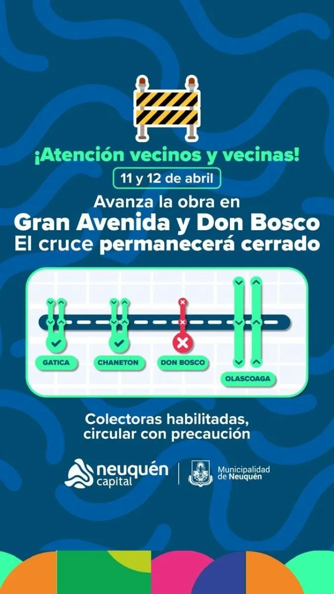 La Municipalidad de Neuquén informó que el cruce de Gran Avenida y Don Bosco permanecerá cerrado los días 11 y 12 de abril debido al avance de obras viales en ese sector.