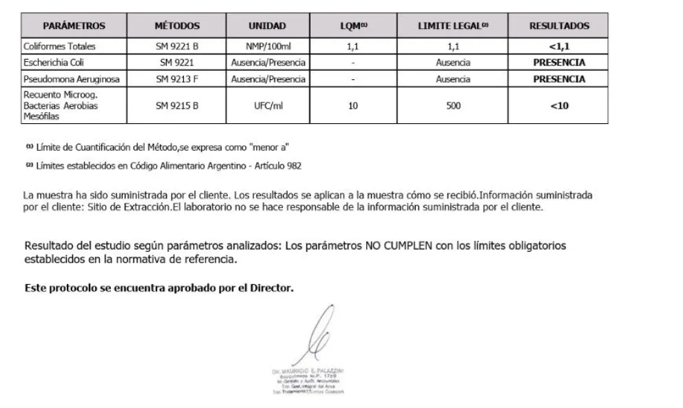 El análisis fue realizado por el Laboratorio Labac y confirmó la presencia de Escherichia coli, una bacteria que indica contaminación y que puede representar un riesgo para la salud.