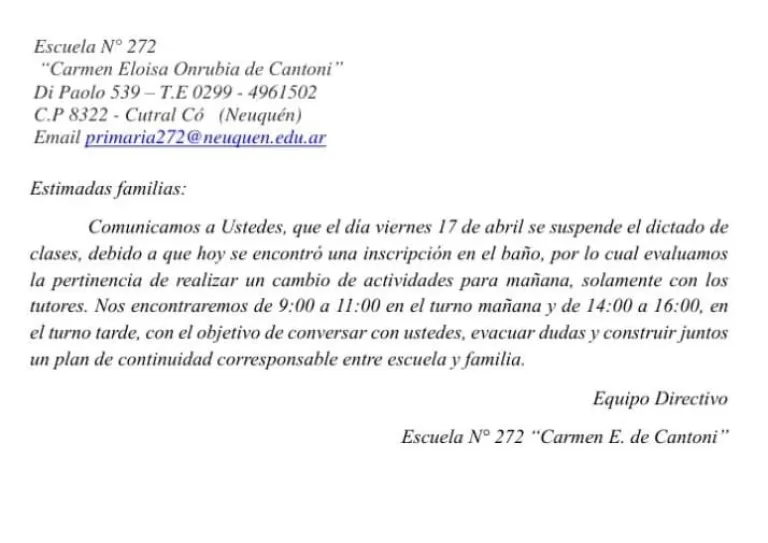 La dirección de la Escuela 272 de Cutral Co decidió suspender las clases del turno mañana este viernes luego de que apareciera una inscripción en la pared de uno de los baños del establecimiento. Aunque no se confirmó oficialmente el contenido del mensaje, existen indicios de que podría tratarse de una amenaza similar a la registrada días atrás en otra institución educativa de la localidad.